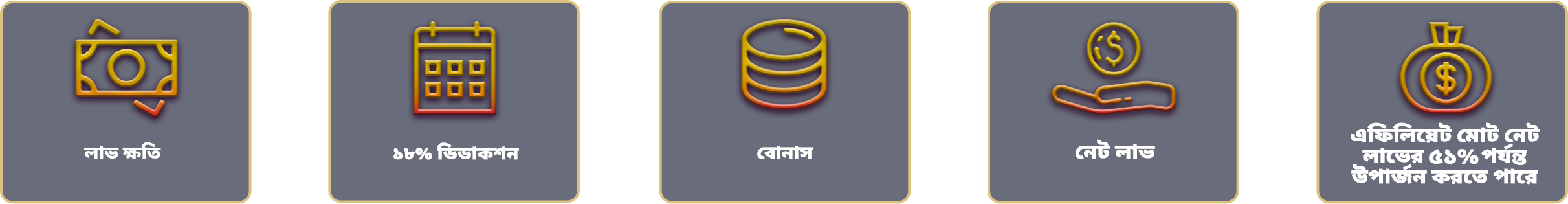 ১. আপনি সাপ্তাহিক ৫১ % পর্যন্ত উপার্জন করতে পারেন। উচ্চতর কমিশন % এর যোগ্যতা অর্জনের জন্য এক্টিভ প্লেয়ার এবং নেট লস উভয়ের প্রয়োজনীয়তা অবশ্যই পূরণ করতে হবে।
